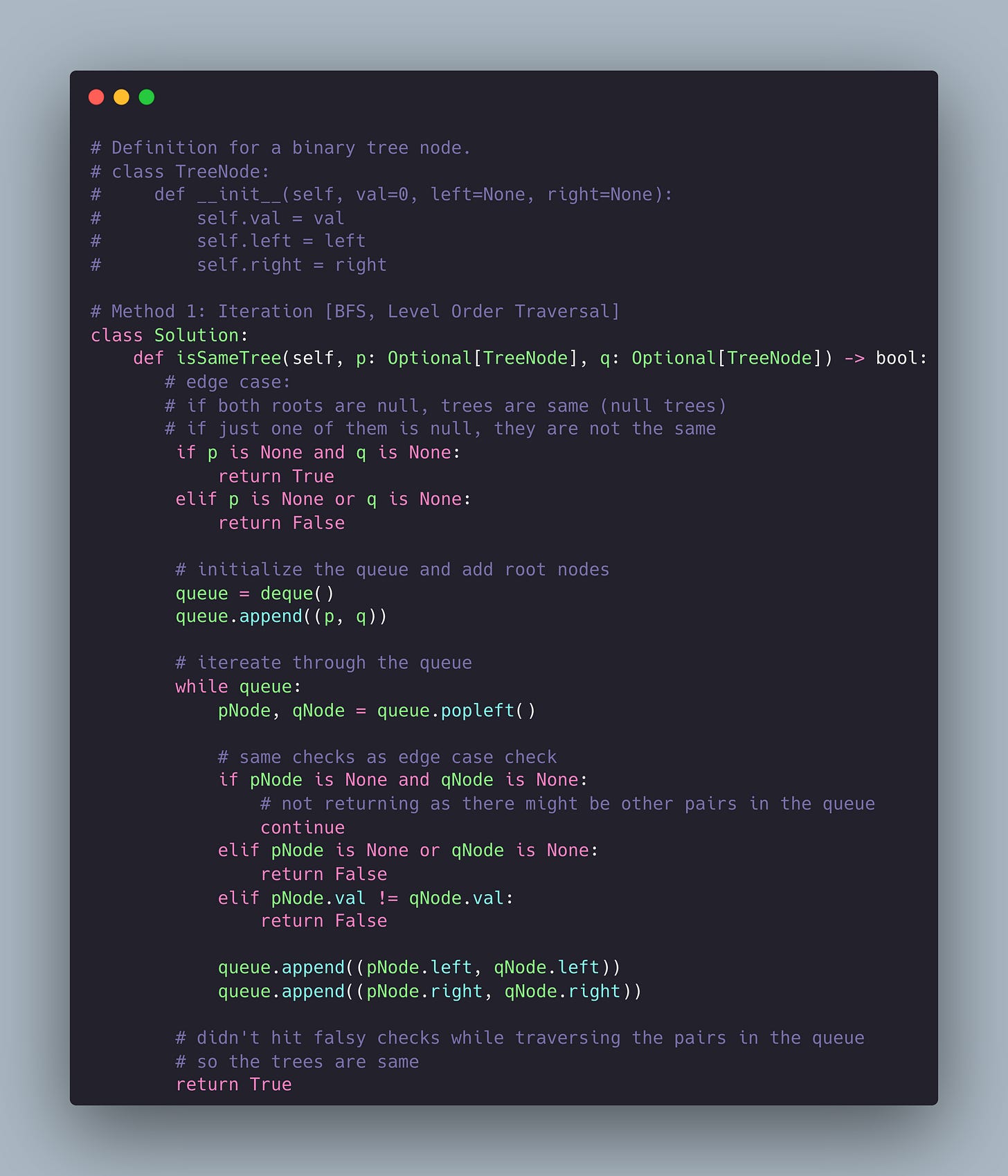 create tuple pairs from left and right nodes of p and q and add them to the queue (don't worry about checking for null since we are doing that in #1 and #2 above when we process them).